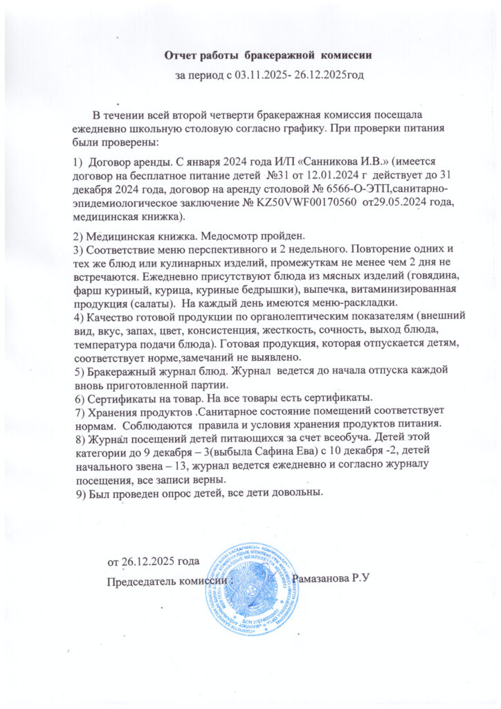 Отчет бракеражной комиссии03.11.2025-26.12.2025